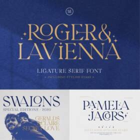 Roger & Lavienna – Ligature Serif is a timeless yet modern serif typeface featuring elegant ligatures and decorative star glyphs. Perfect for logos, branding, presentations, and editorial projects, this font adds sophistication and sparkle to any design. With multilingual support and PUA encoding, it’s easy to access all special characters and stylistic features—just type A+1 through A+5 for star icons. Roger & Lavienna is your go-to serif for designs that demand charm and elegance. For personal use.