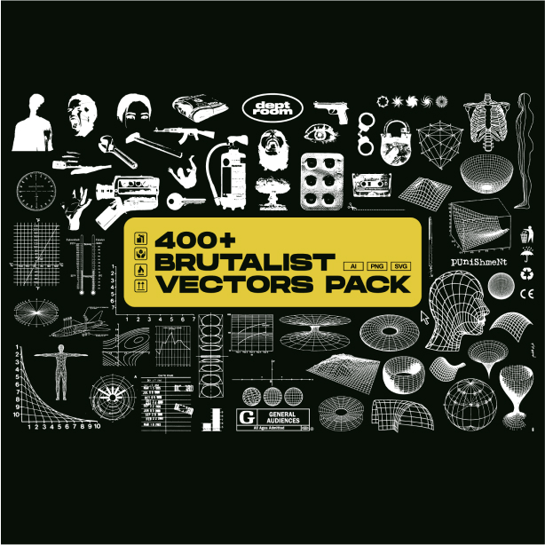 400+ Brutalist Vectors Pack is the ultimate collection for creatives who want to infuse their designs with bold, edgy Brutalist style. Packed with over 400 high-quality vectors—featuring retro-futuristic shapes, wireframes, science graphs, geometric grids, acid graphics, and Y2K-inspired elements—this versatile toolkit is perfect for posters, album covers, streetwear designs, packaging, and more. Available in AI, SVG, and PNG formats with transparent backgrounds, every vector is fully editable and ready for both print and digital projects. For personal use.