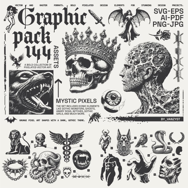 144 MysticPixels Graphic Pack delivers a bold collection of pixelated vector...